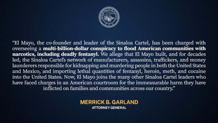 Según Garland, Zambada ahora enfrenta cargos “por el daño incalculable que han infligido a familias y comunidades en todo nuestro país”.