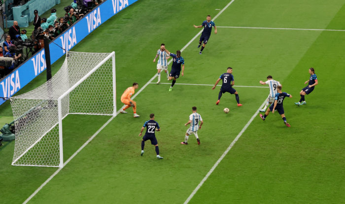 Al 32′, Enzo Fernández asistió en profundidad entre los centrales croatas para Julián Álvarez, quien remató de derecha, pero en la jugada fue impactado por Dominik Livakovic y el árbitro italiano Daniele Orsato marcó la pena máxima.