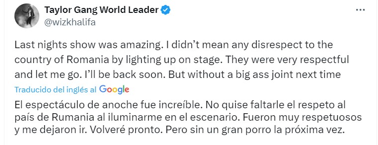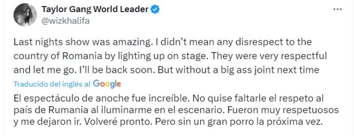“No quise faltar el respeto a Rumanía al encender (el porro) en el escenario. Fueron muy respetuosos y me dejaron salir. Volveré pronto. Pero la próxima vez sin un gran porro”, afirmó el artista en su cuenta de X (antes Twitter).