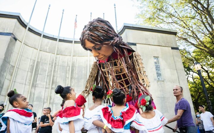 La marioneta de 3.5 metros de altura representa a una niña siria refugiada de 10 años de edad.
