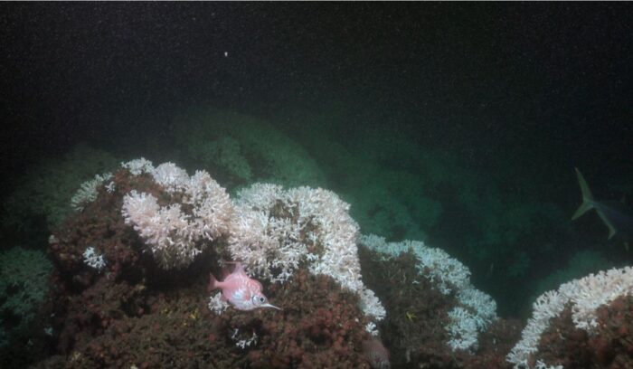Desmophyllum pertusum, una especie de coral pétreo de crecimiento lento de aguas frías, y un pez trompetero (Notopogon sp.). La imagen se capturó a 203 metros de profundidad durante una inmersión con ROV en el borde exterior de la Plataforma Continental, cerca de la cabecera del cañón submarino de José Ignacio. El sitio se encuentra bajo la influencia de la corriente de Brasil, que transporta aguas tropicales y agua antártica intermedia reciclada. Foto: cortesía ROV SuBastian / Schmidt Ocean Institute para Mongabay Latam.