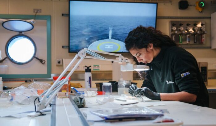 La científica Jessica Risaro, del Consejo Nacional de Investigaciones Científicas y Técnicas, Museo Argentino de Ciencias Naturales, toma submuestras de una estrella de mar para análisis de ADN en el laboratorio principal del buque de investigación Falkor (too), frente a la costa de Uruguay. Foto: cortesía Alex Ingle / Schmidt Ocean Institute para Mongabay Latam.