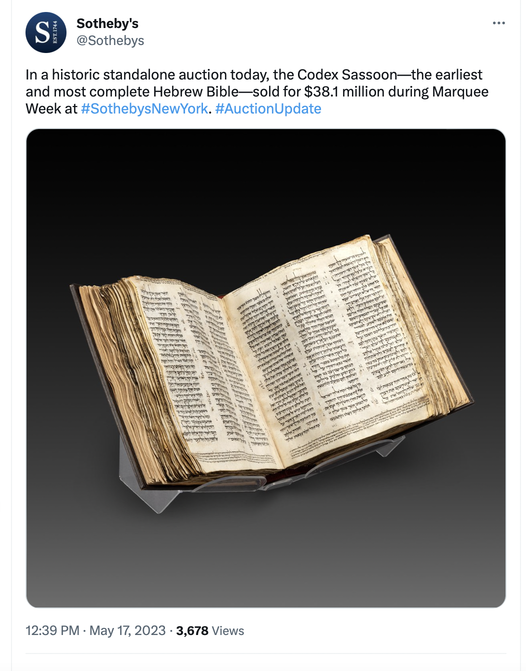 El “códice Sassoon”, el ejemplar de la Biblia hebrea más antiguo y completo de la que se tiene constancia, se subastó este miércoles en Nueva York por un precio final de 37,8 millones de dólares (34,8 millones de euros).