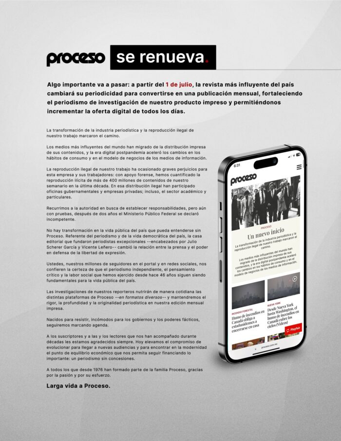 “Algo importante va a pasar: a partir del 1 de julio, la revista más influyente del país cambiará su periodicidad para convertirse en una publicación mensual, fortaleciendo el periodismo de investigación de nuestro producto impreso y permitiéndonos incrementar la oferta digital de todos los días”, dijo Proceso en un comunicado.