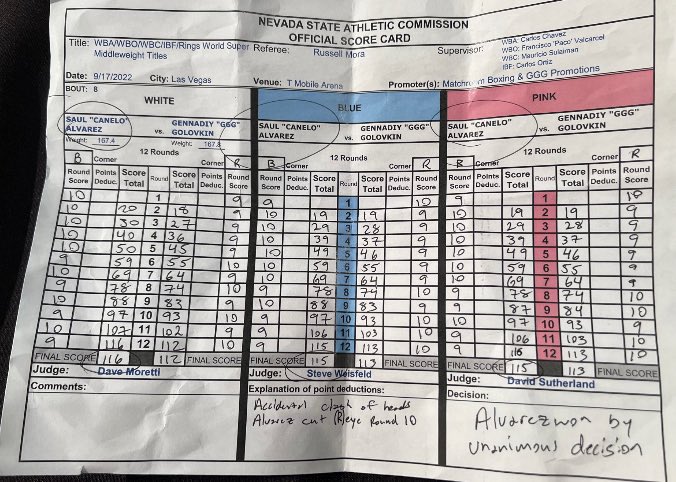 La trilogía concluye con las tarjetas una vez más, ahora a cargo de los jueces Dave Moretti, Steve Weisfeld y David Sutherland, que califican la pelea con 116-112, 115-113 y 115-113 respectivamente, en favor de Canelo por decisión unánime.