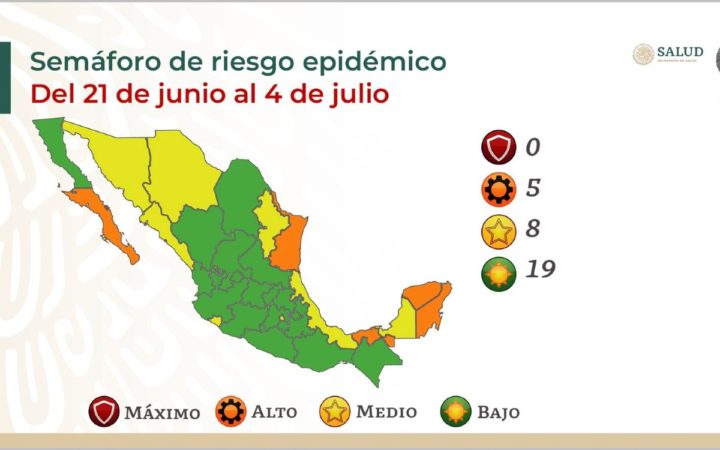 Del 21 de junio al 4 de julio, 19 entidades federativas estarán en verde, ocho en amarillo, cinco en naranja y ninguno en rojo, reporta el informe diario sobre Covid-19, de acuerdo con un comunicado de la Secretaría de Salud.