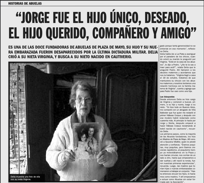 Delia fue una de las doce fundadoras de la Asociación Abuelas de Plaza de Mayo, que busca a los hijos nacidos en cautiverio de los desaparecidos durante la última dictadura militar argentina (1976-1983).