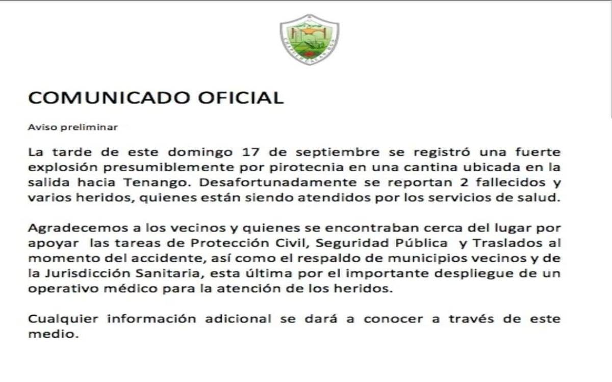 “La tarde de este domingo 17 de septiembre se registró una fuerte explosión, presumiblemente, por pirotecnia en una cantina ubicada en la salida hacia Tenango. Desafortunadamente se reportan dos fallecidos y varios heridos, quienes están siendo atendidos por los servicios de salud”, confirmó la alcaldía.