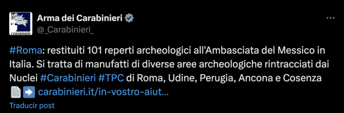 Silli explicó a EFE que estos tipos de devoluciones de manera totalmente voluntaria sirven “a Italia a confirmar su amistad con México porque gracias a la Cultura los países pueden ser amigos”.