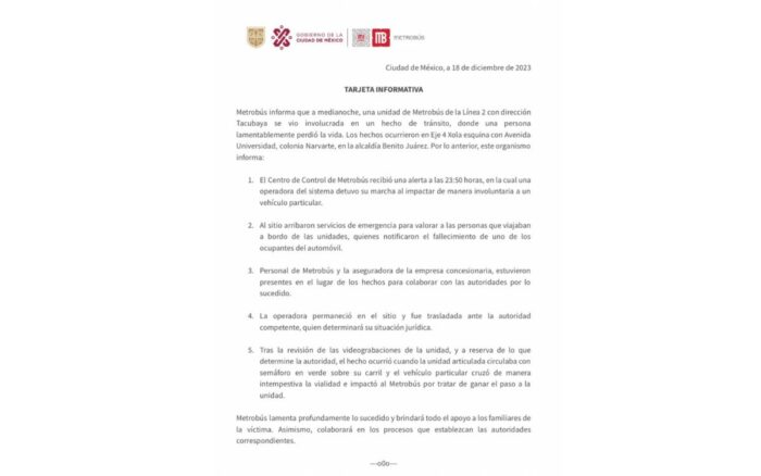 El incidente ocurrió a las 23:50 horas del domingo 17 de diciembre, sin embargo el deceso fue confirmado hasta las 6:49 a.m. de este lunes por el gobierno de la Ciudad de México a través de la cuenta oficial de X del Metrobús .