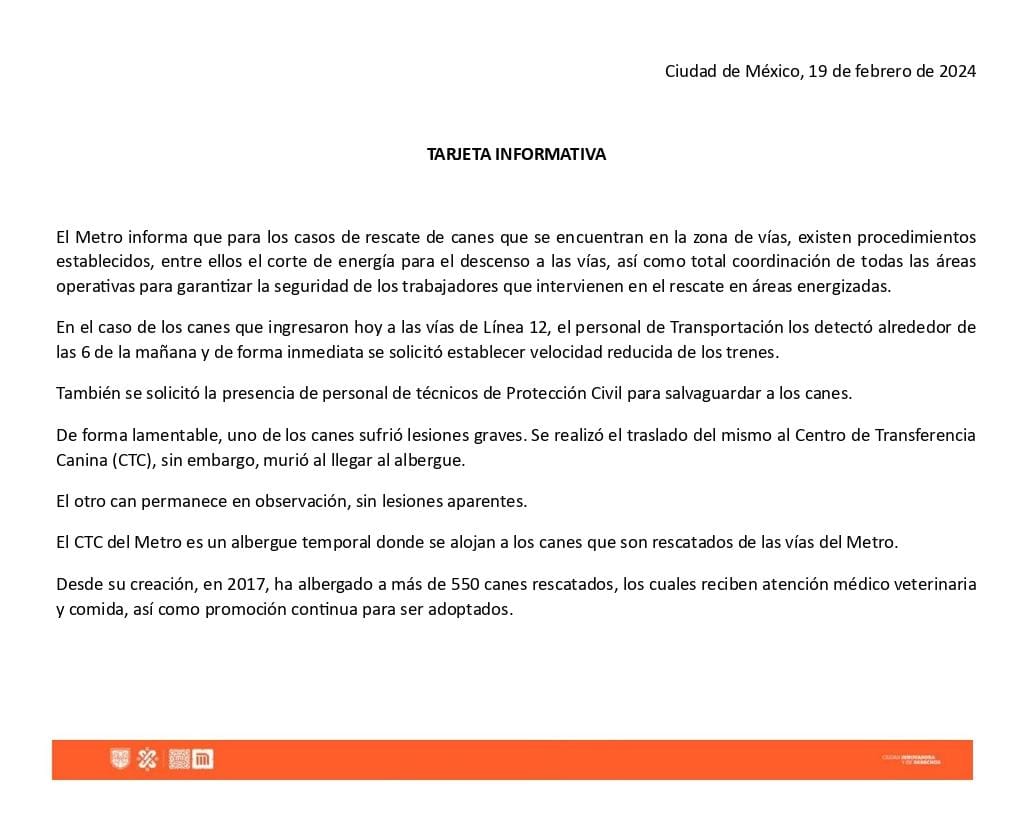 Tras la viralización de la publicación en X, el Metro afirmó que alrededor de las 6:00 a.m, se detectó la presencia de dos caninos en vías de Línea 12, desde ese momento se implementó marcha de seguridad para poder rescatarlos. Después de varios intentos, ambos fueron ubicados y llevados al Centro de Transferencia Canina (CTC).