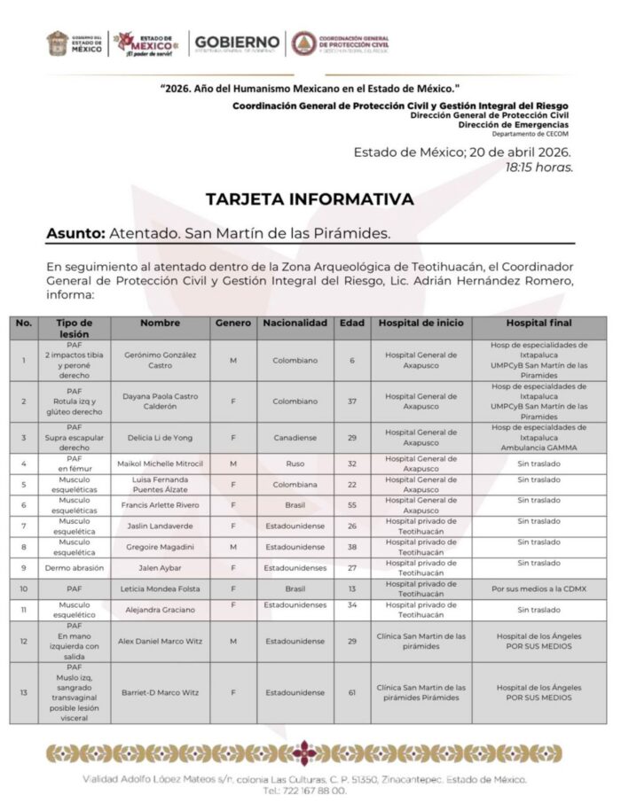 La Fiscalía General de Justicia del Estado de México confirmó que el tiroteo en las pirámides de Teotihuacán ha dejado como saldo una mujer canadiense fallecida, ocho personas lesionadas, entre las que hay un niño de 6 años colombiano, y el agresor muerto aparentemente por suicidio.