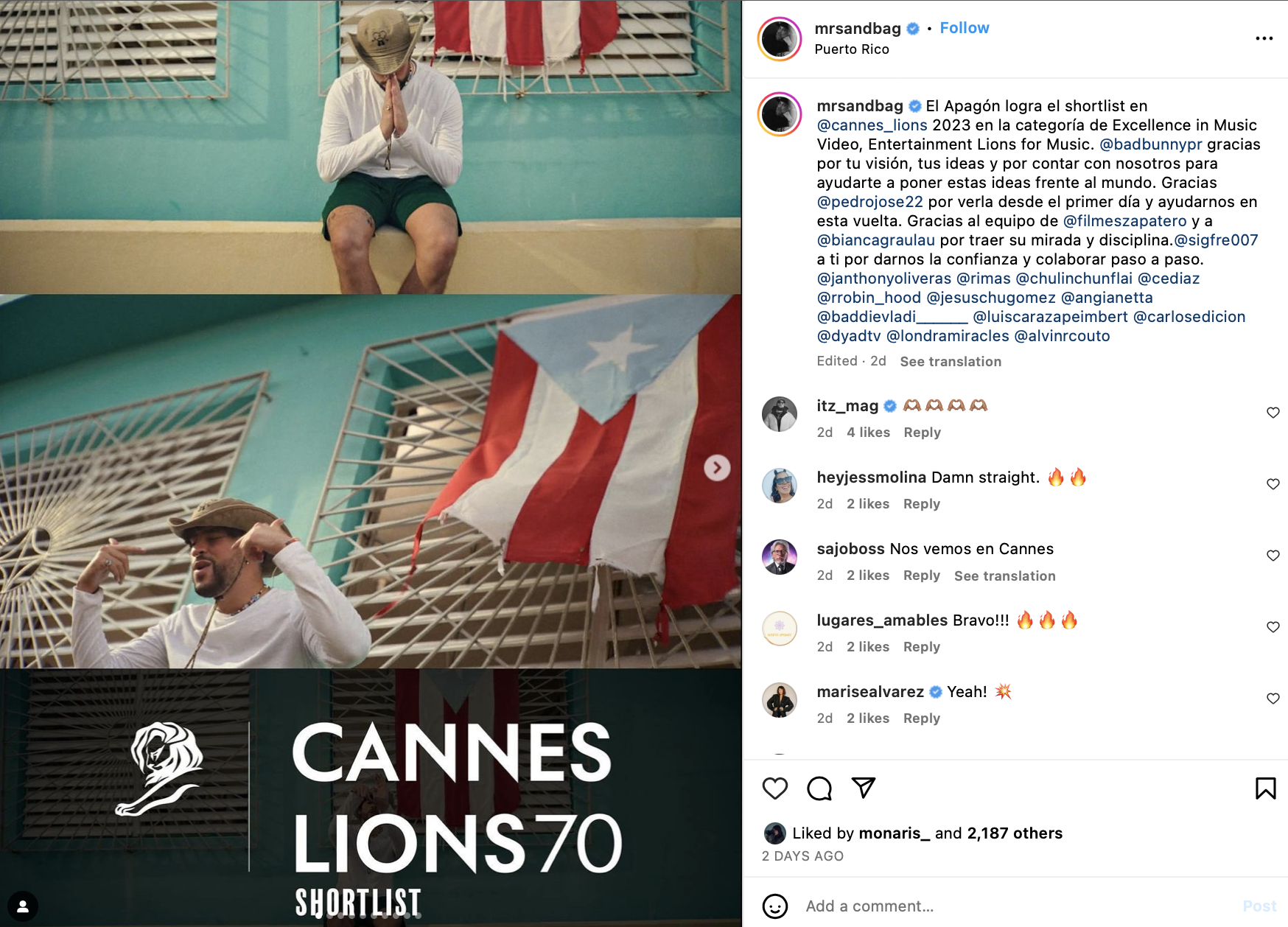 “El Apagón logra el shortlist en Cannes Lions 2023 en la categoría de Excellence in Music Video, Entertainment Lions for Music. Bad Bunny, gracias por tu visión, tus ideas y por contar con nosotros para ayudarte a poner estas ideas frente al mundo.