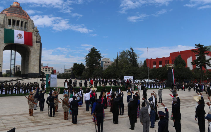 La conmemoración del 110 aniversario de uno de los acontecimientos históricos más importantes de México comenzó a las 9:00 horas en el Monumento a la Revolución con la participación de más de 390 elementos de las fuerzas armadas y 11 charros. También utilizaron para la escenificación 189 caballos.