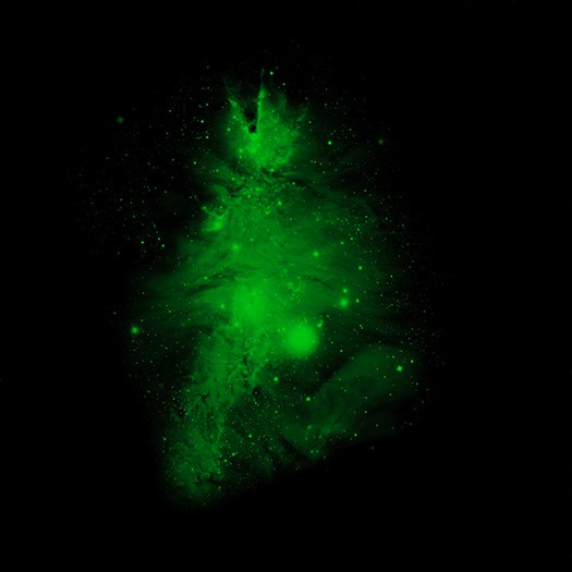 Datos ópticos del telescopio WIYN de 0.9 metros de la Fundación Nacional de Ciencia en Kitt Peak muestran gas en la nebulosa en verde, correspondiendo a las “agujas de pino” del árbol, y datos infrarrojos muestran estrellas de primer plano y de fondo en blanco.