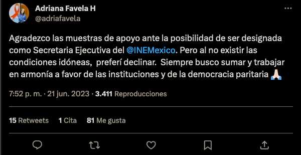 La exconsejera electoral Adriana Favela subió un tuit para justificar su decisión de renunciar de último minuto a la nominación para ser secretaría ejecutiva del Instituto Nacional Electoral (INE).