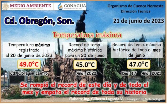 “El día de hoy en Cd. Obregón se rompió el récord de temperatura máxima para un día 20 de junio, el récord para todo el mes de junio; y además se empató la temperaturas más alta registrada desde que se tienen registros. Este valor de 49°C se registró antes el 27 de julio de 2020”.