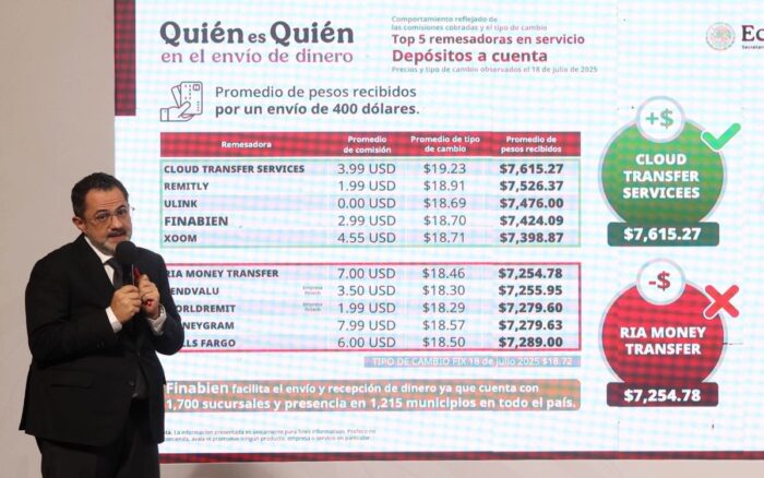 Sobre las remesadoras menos recomendables en esta modalidad, precisó que RIA Money Transfer es la que menos entrega, con “7 mil 254.78 pesos por cada 400 dólares”, mientras que otras como MoneyGram cobran comisiones de hasta 8 dólares.