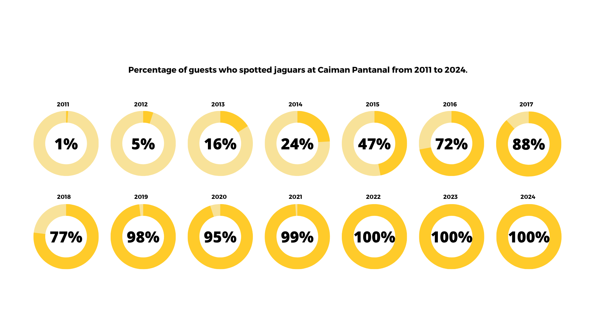 En el año en que se fundó Onçafari, cuando comenzó el proceso de habituación de los jaguares a los vehículos de safari, solo el 1% de los visitantes registró avistamientos. Desde entonces, el trabajo continuo de habituación, llevado a cabo de manera responsable y con protocolos cada vez más refinados y técnicos, ha permitido el acercamiento gradual y seguro de los vehículos a estos animales, aumentando significativamente las posibilidades de observación. En 2022, la tasa de avistamientos alcanzó el 100% y se mantuvo en 100% en 2023 y 2024, reflejando el éxito de este esfuerzo basado en la ciencia.