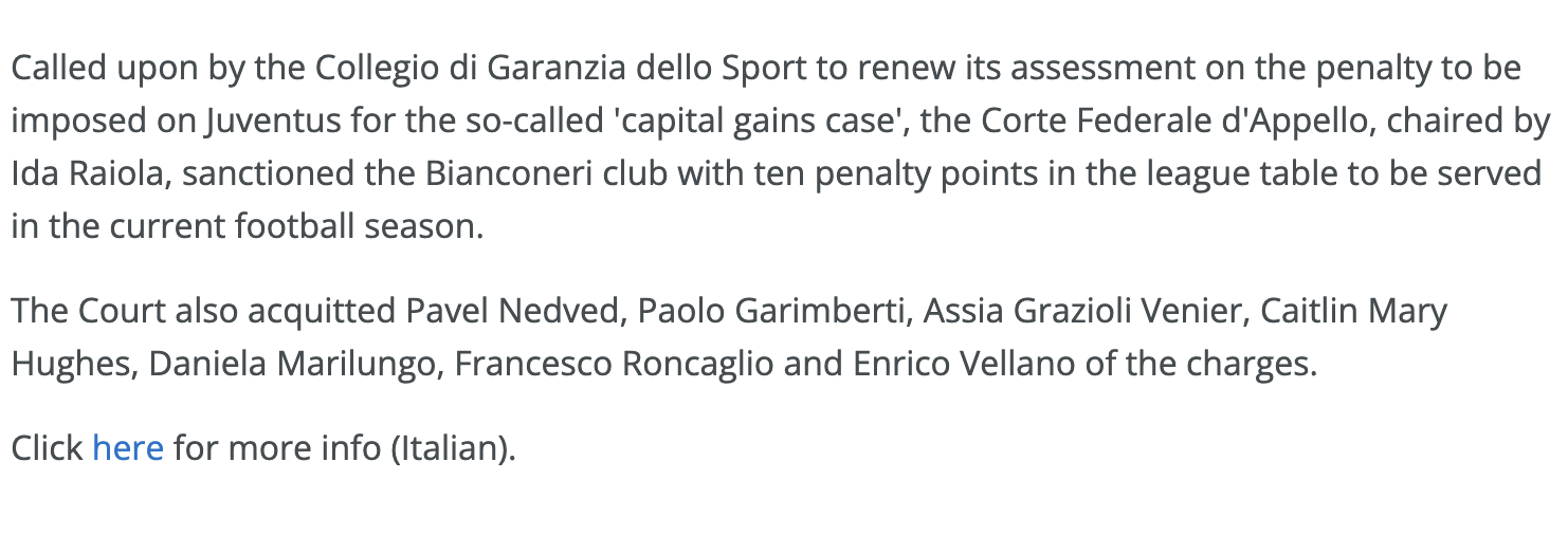 Las sanciones se producen después de que la justicia entienda que la Juventus infló artificialmente el valor de los jugadores en sus cuentas utilizando plusvalías y en la decisión de este lunes, si bien mantuvo los cargos contra el club, absolvió de culpa a los directivos Pavel Nedved, Paolo Garimberti, Assia Grazioli Venier, Caitlin Mary Hughes, Daniela Marilungo, Francesco Roncaglio y Enrico Vellano.