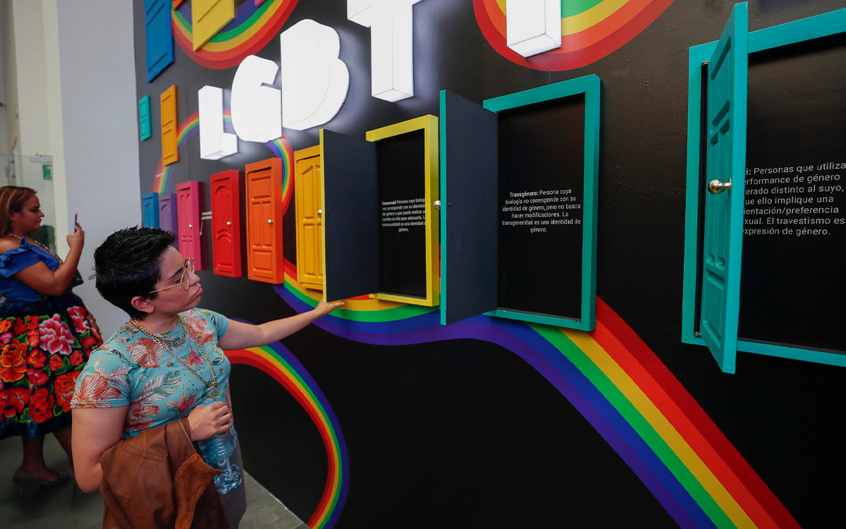 La muestra consta de una amalgama de puertas de diferentes colores que, al abrirlas, ofrecen respuestas a preguntas como “¿Qué significa género?”, “¿Qué es el sexo biológico?” o “La transexualidad, ¿es una enfermedad?”.