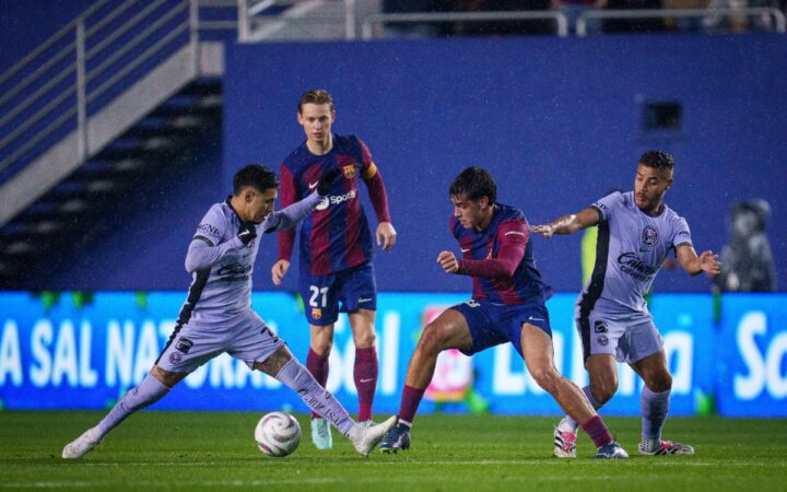 El juego rápido propiciado por la lluvia protagonizó los primeros minutos del partido y Lamine Yamal no tardó en poner el 1-0 en el marcador en el minuto 6′ tras empezar una jugada desde el costado derecho, marcar una excelente diagonal hasta el centro, internarse en el área y superar al portero con un disparo poco fino.