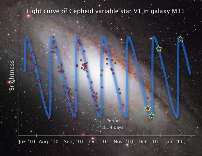 Ahora bien, en la medida en que las Cefeidas se vuelven más brillantes, emiten pulsaciones de forma más lenta. Esto permite a los astrónomos obtener mediciones del brillo intrínseco de la estrella.