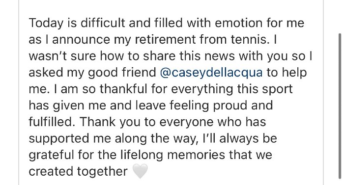 Barty comentó a través de una entrevista con su ex compañera de dobles Casey Dellacqua : “Me retiro del tenis. Estoy tan feliz y tan lista”