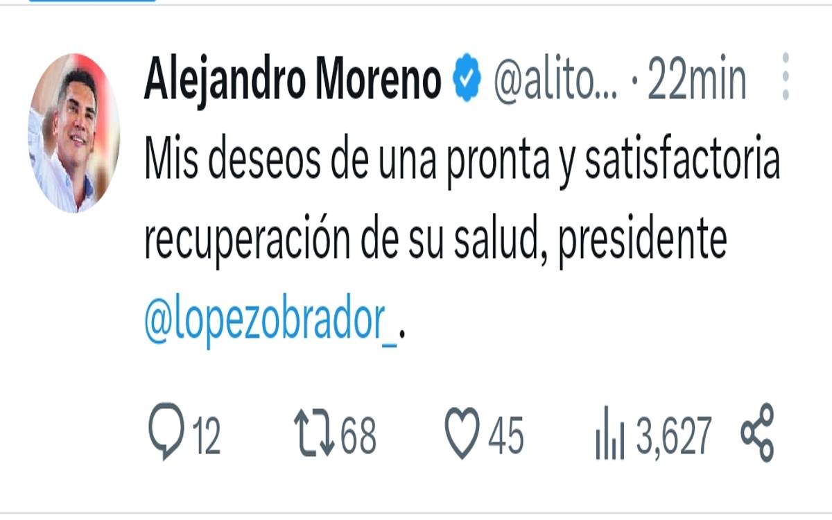 También el dirigente nacional del Partido Revolucionario Institucional (PRI), Alejandro Moreno envió sus deseos de reestablecimiento en un breve mensaje.