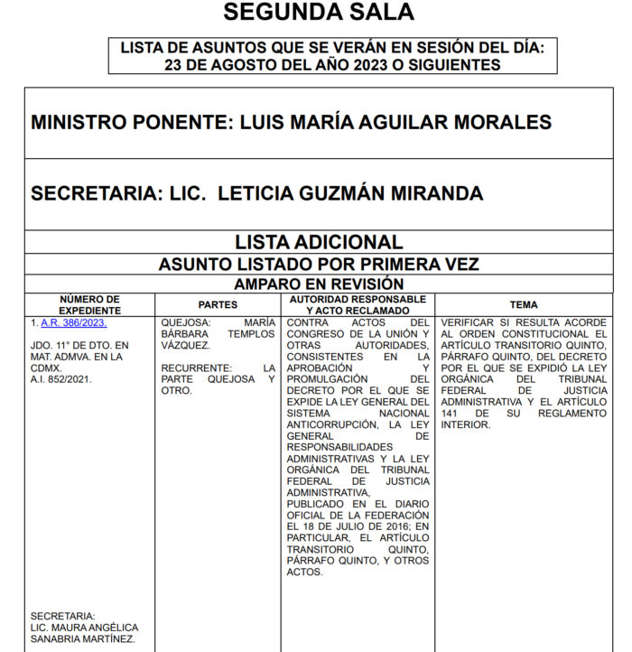 De acuerdo con el proyecto de sentencia que el ministro Luis María Aguilar Morales había presentado en la lista de asuntos para resolver y votar en la Segunda Sala, la destitución procedía en caso de que el presidente Andrés Manuel López Obrador no presentara ante el Congreso de la Unión un dictamen para ratificar en el Tribunal Federal de Justicia Administrativa (TJFA), por un plazo de 10 años, a la magistrada María Bárbara Templos Vázquez.