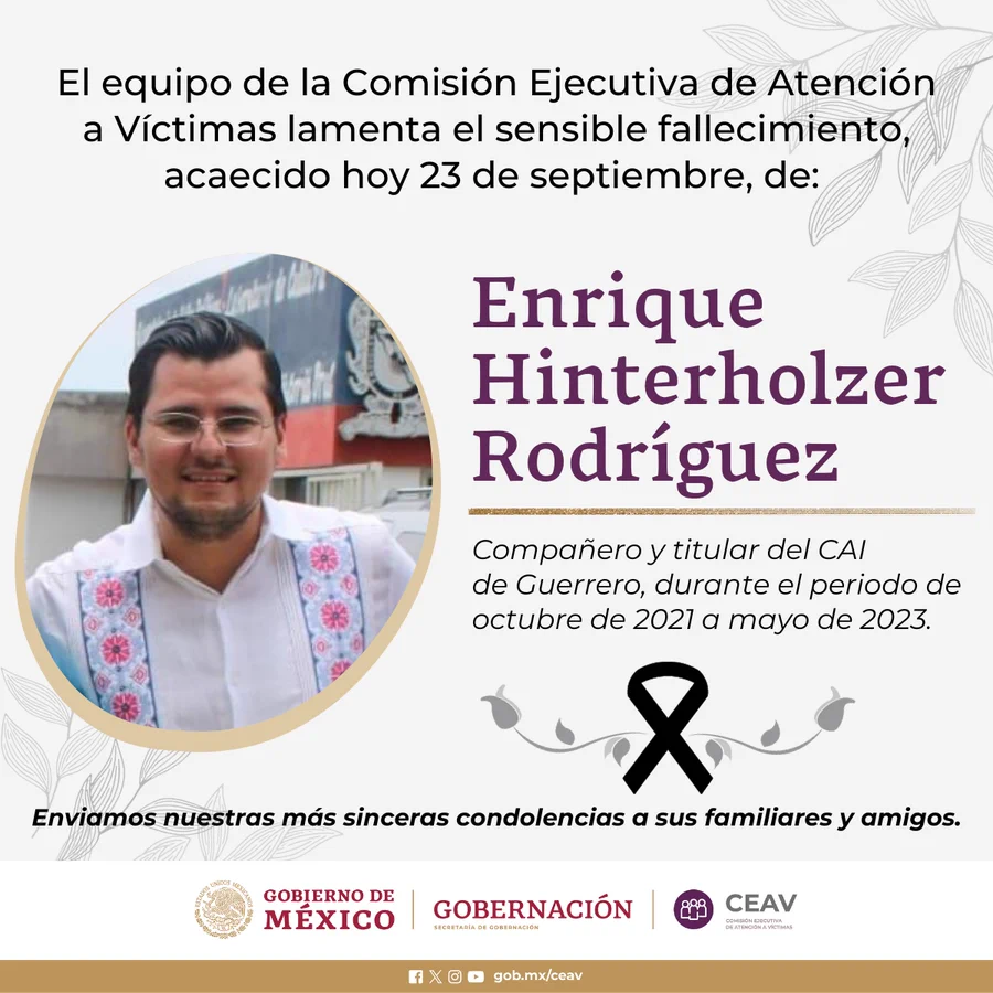 “El equipo de la Comisión Ejecutiva de Atención a Víctimas lamenta el fallecimiento de Enrique Hinterholzer, compañero y titular del CAI Guerrero, durante el periodo de octubre de 2021 a mayo de 2023. Expresamos nuestras condolencias y nos unimos a la pena que embarga a su familia”, escribieron en un breve comunicado.