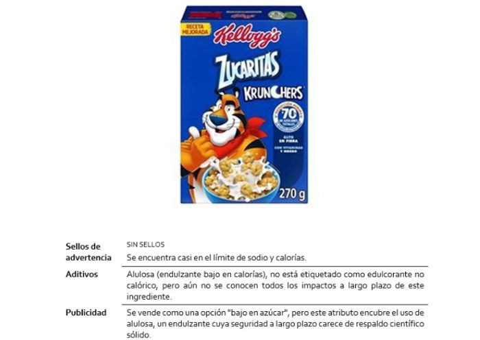 De acuerdo con la radiografía del producto elaborada por EPC, Zucaritas Krunchers no porta el sello de exceso de azúcares debido al uso de la alulosa, un ingrediente que “no es considerado azúcar ni tampoco edulcorante”.
