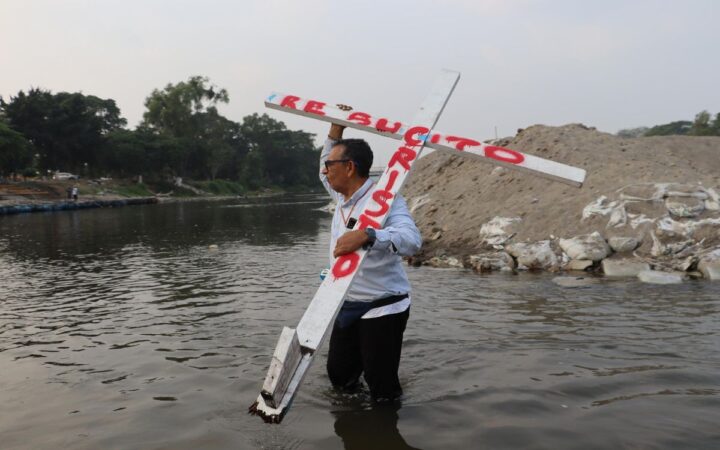El director del Centro de Dignificación Humana (CDH), Luis Rey García Villagrán, cruzó el río Suchiate que divide a México con Guatemala cargando una enorme cruz, como parte del ‘Viacrucis del Migrante’, para pedir mejores políticas humanas para la migración en el país.