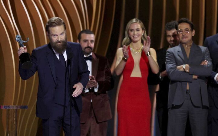 “SAG-AFTRA gracias por pelear por nosotros, gracias a cada miembro que nos apoyó. La última vez que estuvimos todos juntos fue en una alfombra roja de la que nos retiramos (por la huelga) en solidaridad. Esto es un cierre de ciclo para nosotros”, dijo el actor Kenneth Brannagh, quien recibió el galardón en nombre del elenco de ‘Oppenheimer’.