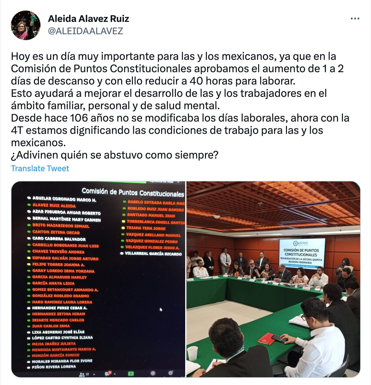 De acuerdo con la diputada de Morena, Aleida Alavez Ruiz, “esto ayudará a mejorar el desarrollo de las y los trabajadores en el ámbito familiar, personal y de salud mental. Desde hace 106 años no se modificaban los días laborales, ahora con la 4T estamos dignificando las condiciones de trabajo para las y los mexicanos”.