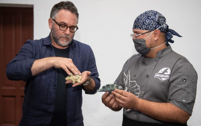 En una de las fotografías difundidas en la cuenta oficial de Facebook se observa al director Colin Trevorrow tratando de hacer una “Dinoquesadilla”, quesadilla en forma de dinosaurio.