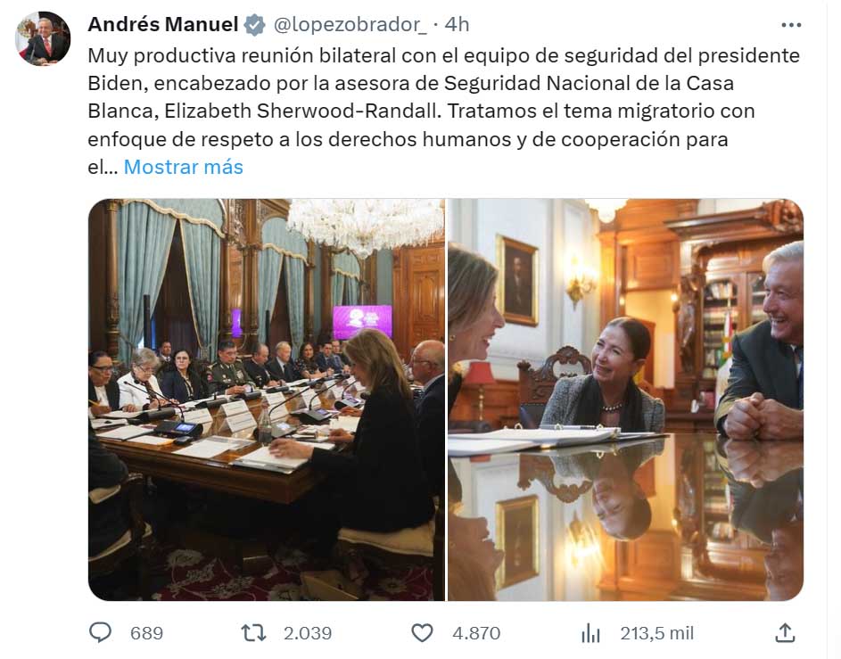 “Tratamos el tema migratorio con enfoque de respeto a los derechos humanos y de cooperación para el desarrollo de los pueblos, así como el combate al tráfico de fentanilo y de armas”, expresó López Obrador en un mensaje en redes sociales.