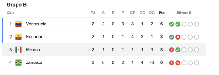 Con este resultado, Venezuela llegó a seis puntos como líder del Grupo B y clasificó a Cuartos de Final; en tanto, México se estancó con 3 unidades, las mismas que Ecuador. En el fondo está Jamaica sin sumar y ya eliminado.