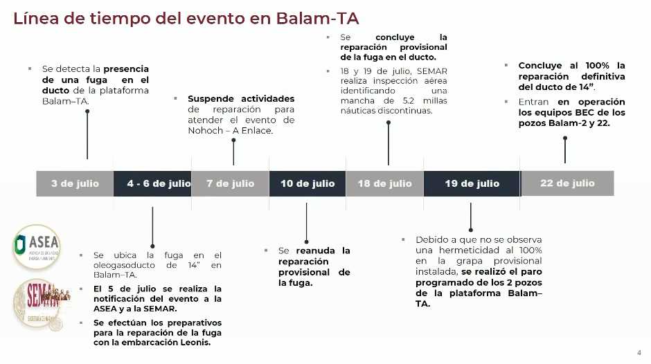 La fuga se detectó el 3 de julio y su reparación concluyó el 22 de julio. En una lámina Pemex calculó que la fuga duró 18 días.