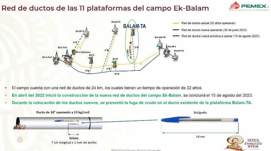 El campo Ek-Balam se localiza a 95 kilómetros al noroeste de Ciudad del Carmen, Campeche; inició su explotación hace 32 años (1991), con 13 plataformas, de las cuales hoy solo operan 11 y 40 pozos productores.