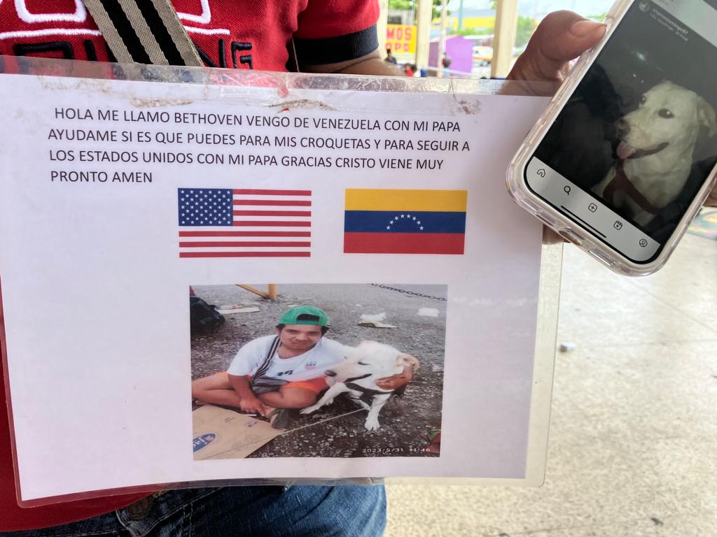 “Hola soy Bethoven, vengo de Venezuela con mi papá. Ayúdame si es que puedes con mis croquetas para seguir a los Estados Unidos. Gracias”.