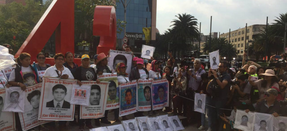 A cinco años de la desaparición de los 43 normalistas de Ayotzinapa, familiares, estudiantes de la Normal Isidro Burgos, de la UNAM y del IPN salieron en punto de las 16:20 horas del Ángel de la Independencia hacia el Zócalo con la exigencia de justicia y esclarecimiento del caso.
