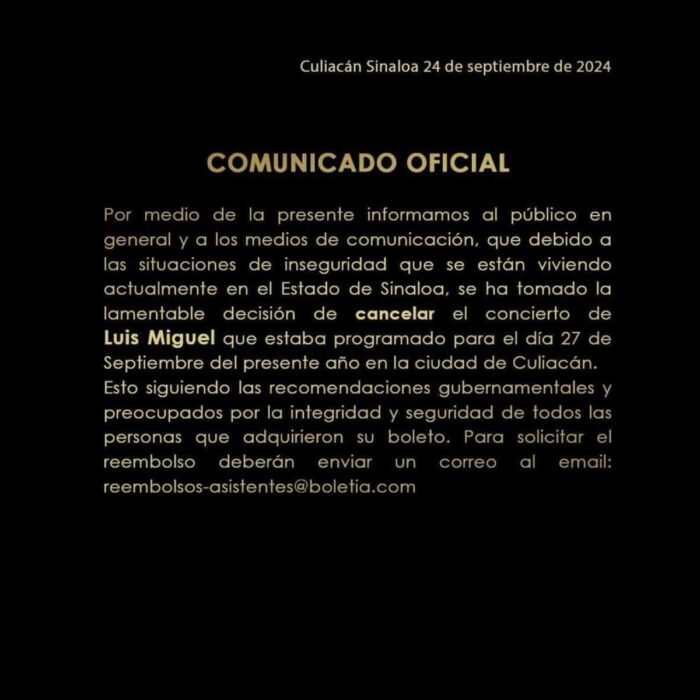 “Por medio de la presente informamos al público en general y a los medios de comunicación, que debido a las situaciones de inseguridad que se están viviendo actualmente en el Estado de Sinaloa, se ha tomado la lamentable decisión de cancelar el concierto de Luis Miguel que estaba programado para el día 27 de Septiembre del presente año en la ciudad de Culiacán.”