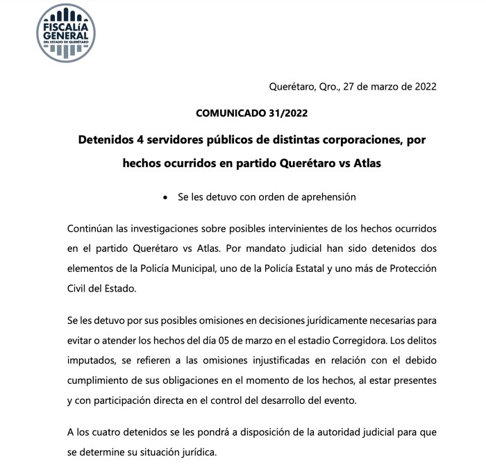 Continúan investigaciones sobre posibles intervinientes de los hechos en el partido Querétaro vs Atlas. Por mandato judicial han sido detenidos 2 elementos de la Policía Municipal, 1 de la Policía Estatal y 1 más de Protección Civil del Estado.