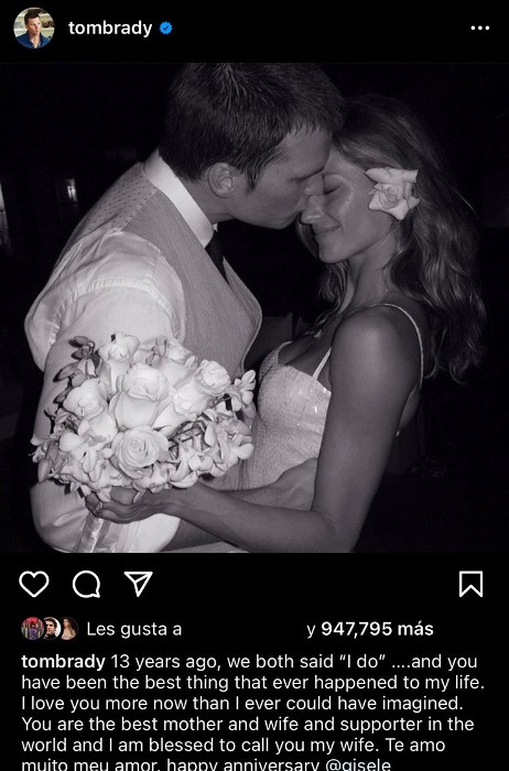 “Te amo más ahora de lo que nunca podría haber imaginado. Eres la mejor madre, esposa y compañera del mundo y tengo la bendición de llamarte mi esposa. Te amo mucho mi amor, feliz aniversario @gisele”.