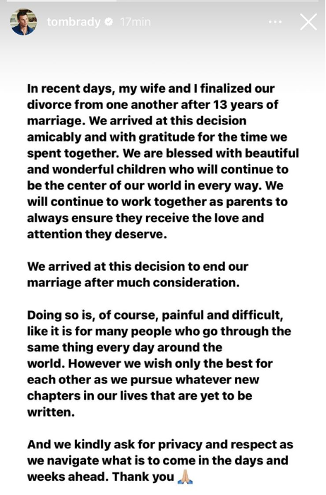 Brady, de 45 años, también se pronunció sobre la separación; “En días recientes, mi esposa y yo finalizamos nuestro divorcio después de 13 años de matrimonio. Llegamos a esta decisión amigablemente y con gratitud por el tiempo que pasamos juntos”.