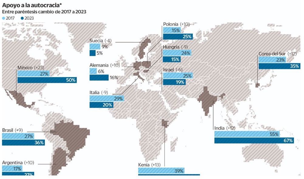 Según este estudio, México es el país en el que más ha crecido, respecto a la última encuesta del 2017, el apoyo a la autocracia: 50% de la ciudadanía muestra su apoyo a la idea de un líder fuerte que pueda tomar decisiones sin interferencia de los tribunales o parlamentos, respecto al 27% de la última muestra, creciendo veintitrés puntos porcentuales.