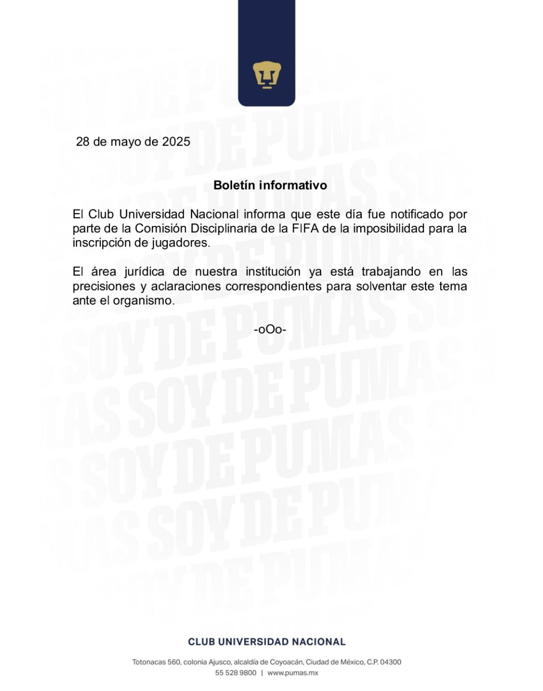 “El Club Universidad Nacional informa que este día fue notificado por parte de la Comisión Disciplinaria de la FIFA de la imposibilidad para la inscripción de jugadores. El área jurídica de nuestra institución ya está trabajando en las precisiones y aclaraciones correspondientes”, señalaron los felinos.
