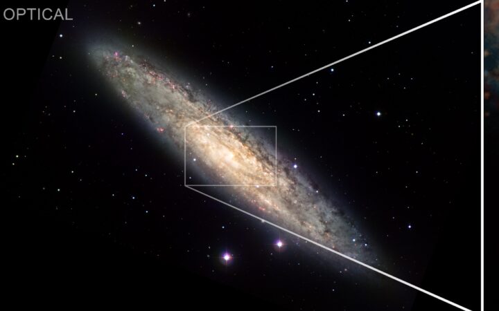 Una nueva imagen compuesta de NGC 253 en el recuadro incluye datos de Chandra (rosa y blanco) que muestran que estos vientos soplan en dos direcciones opuestas alejándose del centro de la galaxia, hacia la parte superior derecha e inferior izquierda. En esta imagen también se muestran datos de luz visible (cian) y emisión de hidrógeno (naranja), ambos de un telescopio de 0,9 metros en el Observatorio Kitt Peak, y datos infrarrojos del Telescopio Espacial Spitzer de la NASA (rojo). Desde el punto de vista de la Tierra, NGC 253 aparece casi de canto, como se ve en la imagen más amplia del gráfico, que muestra una imagen óptica del Observatorio La Silla del Observatorio Europeo Austral en Chile.