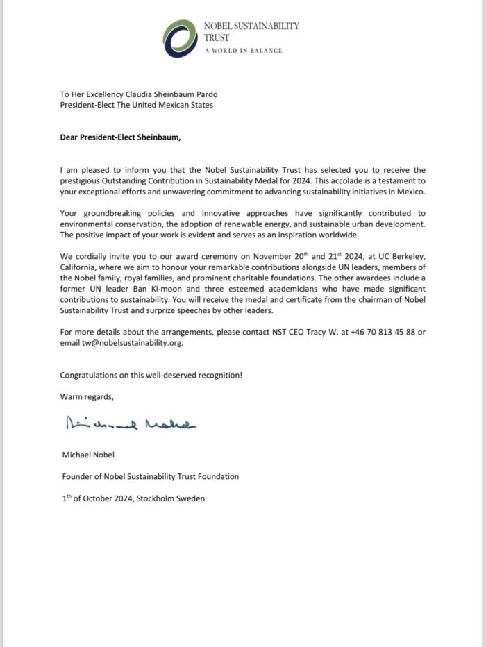 La presidenta Claudia Sheinbaum Pardo será galardonada con la Medalla a la Contribución Destacada en Sostenibilidad 2024 del Nobel Sustainability Trust.